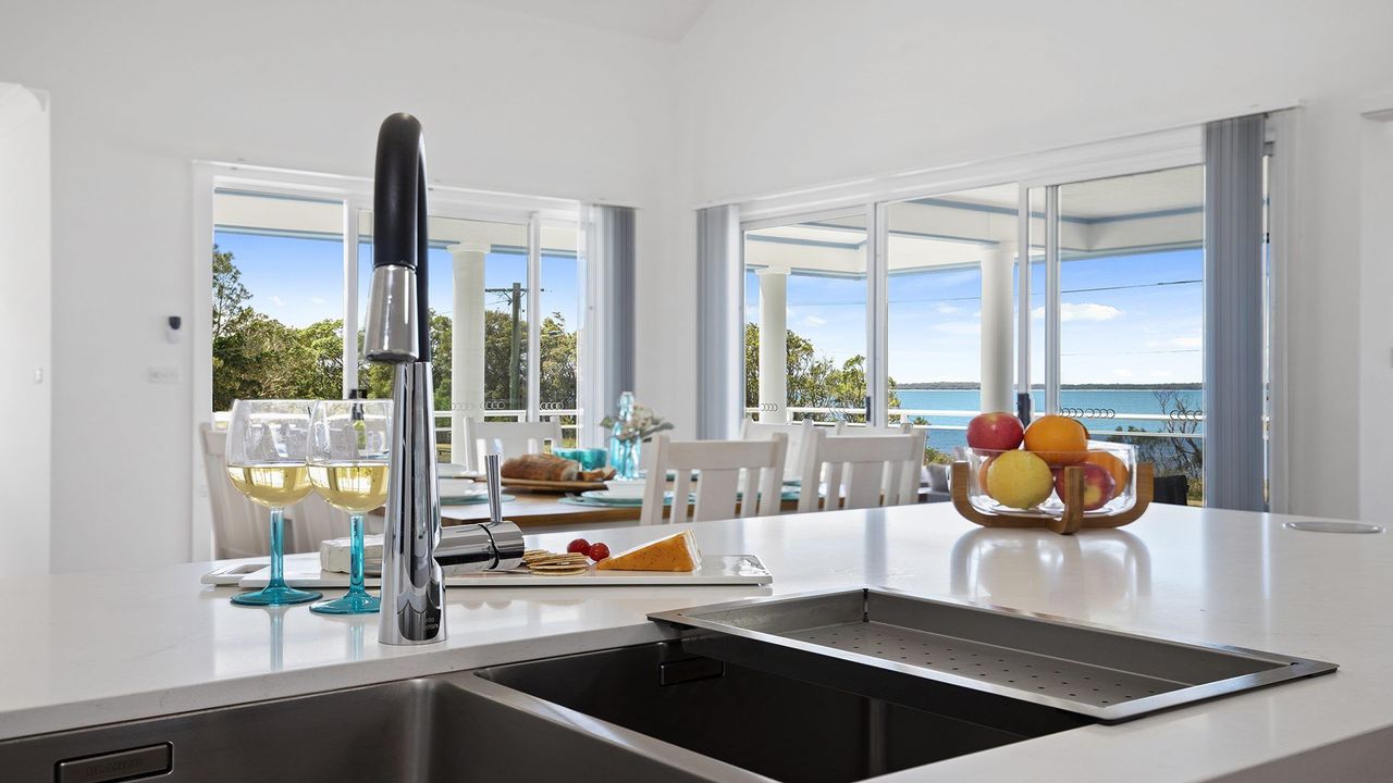 Beautiful views from the front deck and a large living space. Table tennis and the theatre room were fantastic for kids. Highly recommended—Bay Views Callala Bay.