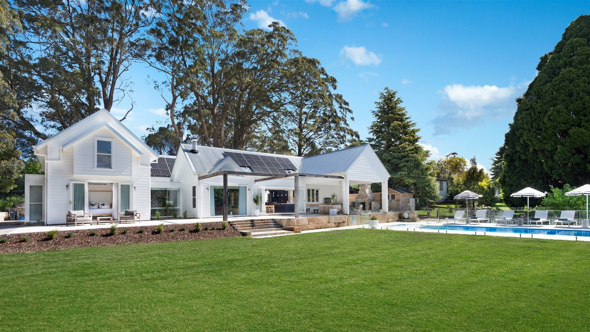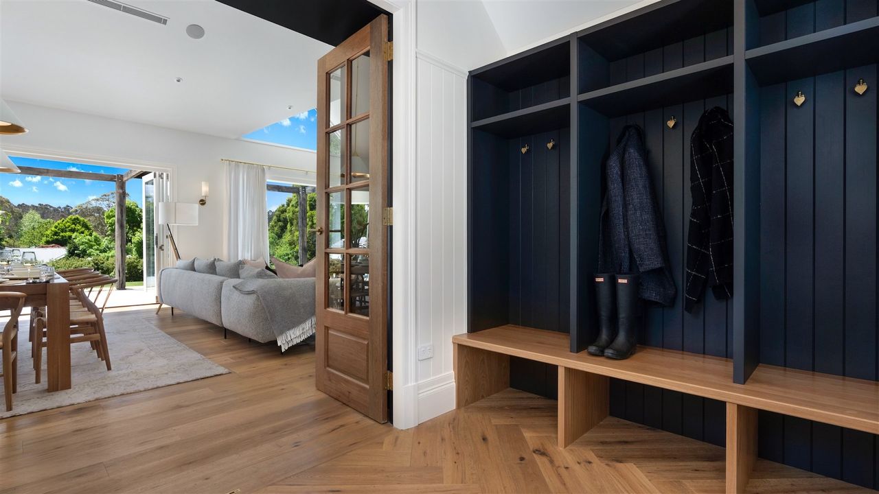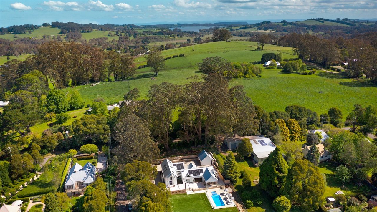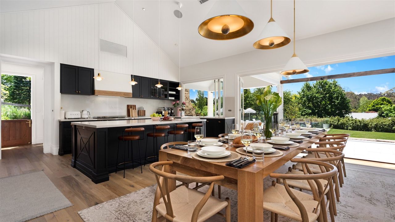 Burrawang House is a luxury five-bedroom country retreat nestled in the prized Southern Highlands village of Burrawang, a 15-minute drive from Bowral. Set on one-acre and bathed in sunlight, this house is surrounded by towering 100-year-old trees and features a pool, outdoor spa, alfresco dining area with fire-pit, and plenty of other spaces to eat, drink and relax. This is country life at its best. The huge kitchen is the heart of the home and features a three-metre island bench, Bertazzoni oven, and north facing cantilevered window which opens to the outside living room.
