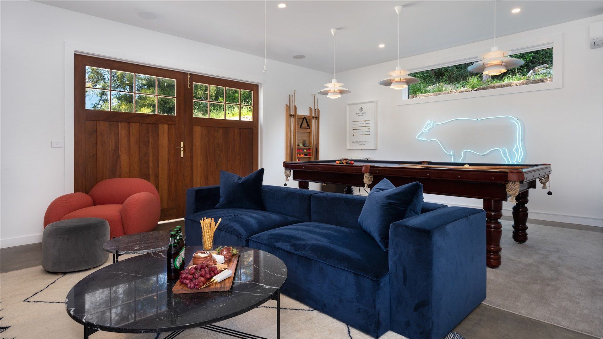 The large open plan living space features a towering cathedral roof design, oak floorboards, and light streaming in through windows on all sides. This architecturally designed weather-board home is ideal for couples or families with five bedrooms, five bathrooms and a separate games room with professional sized snooker table, dartboard, lounge, smart TV and wood burning fireplace. Spend sunny days in the garden, enjoy a game of table-tennis, or take a dip in the spa. The magic of Burrawang is the quiet days, star-filled nights, crisp fresh air and the incredible colours of changing seasons.
