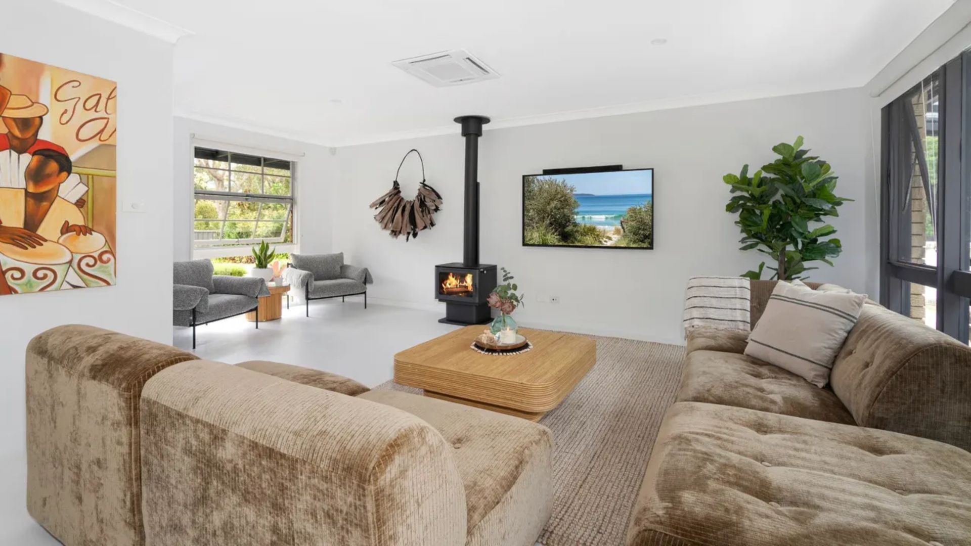 The open plan living, dining, and kitchen area, all conveniently located on one level, is a hub of comfort, featuring reverse cycle air conditioning to keep things cool in summer and a slow combustion fireplace to bring warmth and charm on cooler evenings. The fully equipped kitchen features all the essentials for family feasts, including a dishwasher, microwave, and Nespresso coffee pod machine. Enjoy a movie night with WiFi and a smart TV in the inviting lounge area.