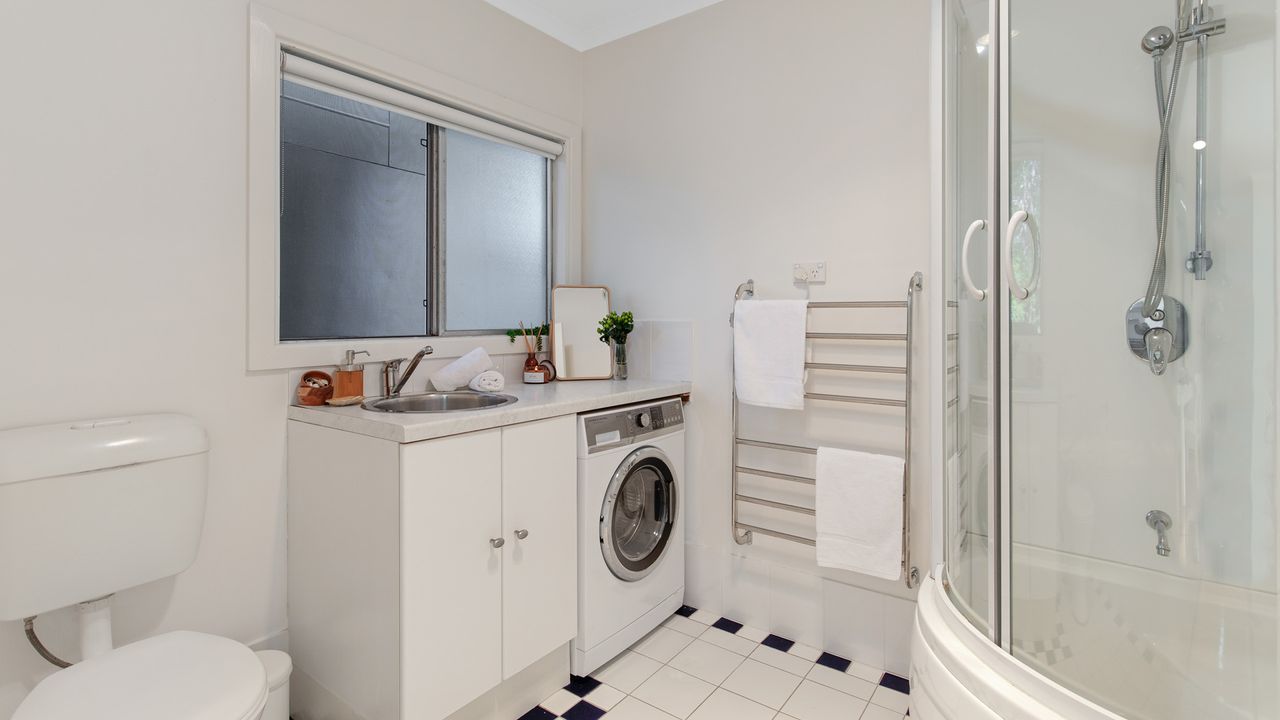 • Bathroom 1: shower over small bath, toilet, vanity and hairdryer