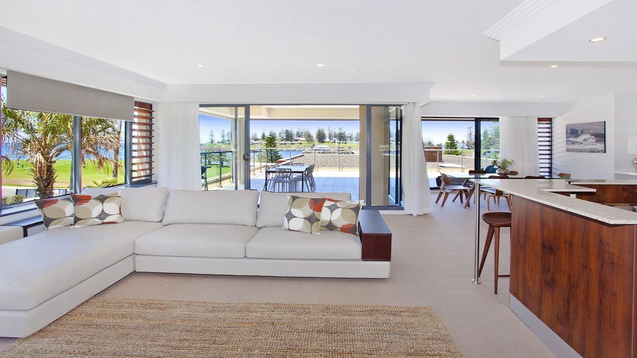 The open-plan living area is filled with natural light and overlooks the Sebel Hotel's gardens, while the stacker doors bring the sunshine into the kitchen and dining area. The large living area is luxurious with King Furniture lounge, and a large flat-screen TV.