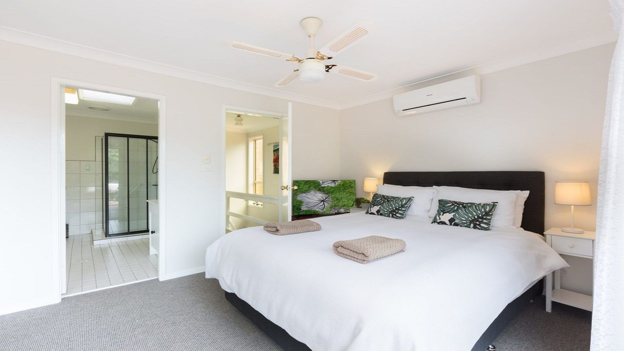 The upper level features two bedrooms, the main with a queen bed and its own full-width balcony. The master also features reverse cycle air conditioning and access to the two-way bathroom. Bedroom two caters to an additional three guests with a tri-bunk, which has a queen bed on the bottom and king single on top. There is a reverse cycle, split system in this room for added comfort.