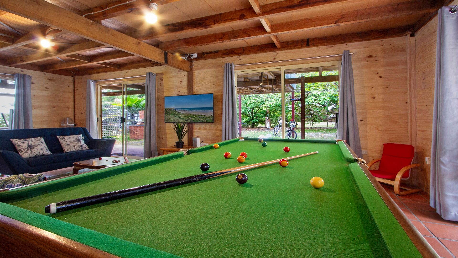 Like all Queenslander-style houses built on supporting poles instead of structural walls, the area downstairs offers a spacious games room with pool table, TV, lounging area and plenty of books to browse and games to play. There is also an extra bedroom as well as a combined bathroom and laundry on this level.